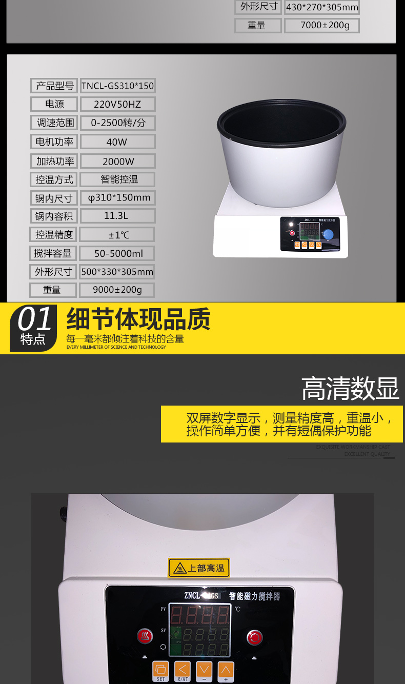 ZNCL-GS型 數(shù)顯磁力(加熱鍋)攪拌器,加熱鍋尺寸分四種:直徑130mm高60mm;直徑190mm高105mm;直徑240mm高150mm;直徑310mm高150mm;控溫范圍:室溫-250℃,控溫精度:±1℃;攪拌速度:50-2500轉(zhuǎn)/分;溫度、轉(zhuǎn)速均可數(shù)字設(shè)定;定時(shí)功能、調(diào)壓功能、液晶顯示可選。