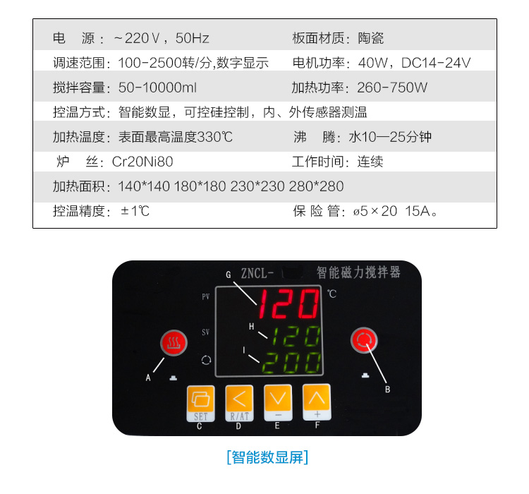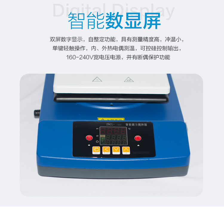 數顯磁力(加熱板)攪拌器,采用方形陶瓷面板加熱面加熱,美觀防腐;電源:220V/50Hz(可做出口型110V/50Hz)控溫范圍:室溫-380度,控溫精度:±1℃,轉速范圍:0-2500轉/分,加熱攪拌面盤分四種:140×140mm、180×180mm、230×230mm、280×280mm;定時功能、調壓功能可選。